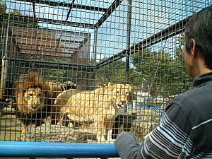 例えば以前、名古屋の東山動物園でライオンを見ましたが、ライオンまでの距離が遠くて百獣の王の迫力を感じる事が出来ませんでした。しかし、こちら茶臼山動物園では間近で見る事が出来、まず、そのデカサにビックリ。さらにライオンのお食事タイムは手を伸ばせば触れるほどの距離で見せてもらいました。飼育員さんが、ライオンのお食事について習性を解説しながら、「ちょっとライオンにガンをつけてみましょう!」と言うので、ガンをつけると、牙をむいて凄い唸り声で、こちらを威嚇してきます。もう迫力満点で、さすが百獣の王という感じでした。