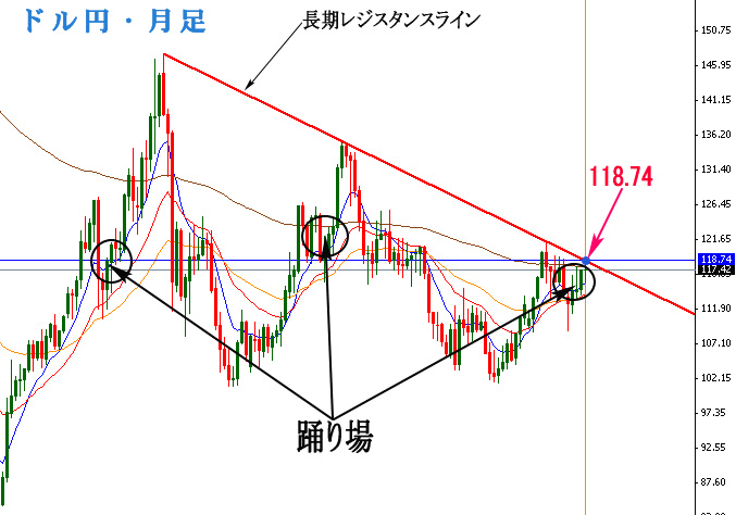 見て分かる通り、ドル円相場は月足では下降トレンドであるわけですが、永遠に、このレジスタンスラインに抑え付けられるという事はありえません。なぜなら、株ではないので、1ドルが0円になる事はあり得ないからです。つまり、いつかはこのレジスタンスラインを上に突き破るという事です。