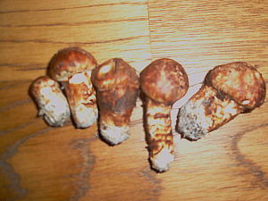 バカマツタケというキノコをご存知でしょうか?上の写真のように、見た目はマツタケにとてもよく似ています。香りもマツタケと似ていますが、却ってマツタケより強いくらいです。もちろん食用で美味ですし、歯ごたえも悪くありません。マツタケとの違いは、大きさが小さく、左の写真のものは、大人の親指くらいしかありません。それとアカマツではなく、コナラなどの広葉樹林に生えることです。キノコそのものはマツタケに勝るとも劣らないのに、アカマツ林ではなく広葉樹林に生えるというだけでバカ呼ばわりされているようです。ちなみに学名も「Tricholoma bakamatsutake」と言うようで、バカが入っています。キノコにとってはなんとも迷惑な話です。(笑)